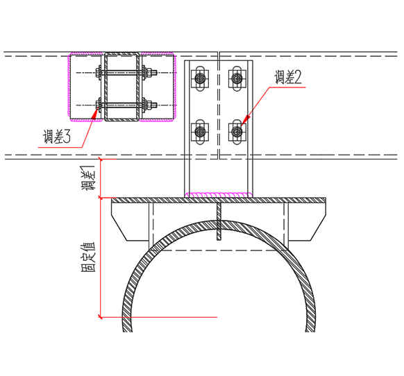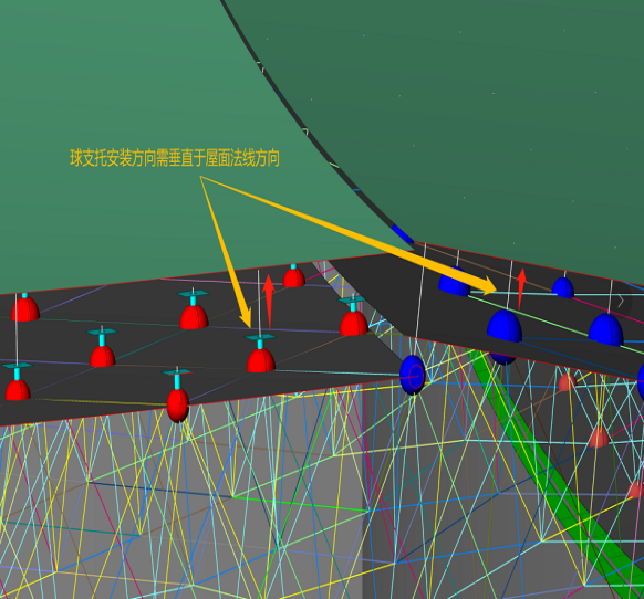 在進行屋面檁條支座安裝時,球之托安裝方向隨著網(wǎng)架的變化,角度也在一直變化,項目團隊通過三維建模將球支托垂直于屋面板方向(法線方向)并提取球支托坐標(biāo),嚴(yán)格按照坐標(biāo)施工定位,保證球之托角度安裝準(zhǔn)確。屋面檁條通過鋼檁托與球之托相連,檁條連接采用螺栓連接形式,并設(shè)計長圓孔調(diào)整施工誤差,保障了檁條完成面的平整度和順滑度。