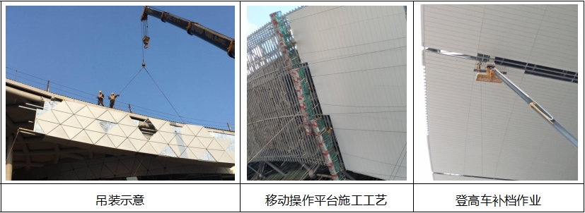 龐大的安裝面積,龍骨的安裝工作顯得尤為復(fù)雜且耗時。為了提升效率,項目團隊采取了分段拼裝的方式,每6米作為一跨進行精細組裝,不僅簡化了施工流程,更大幅縮短了工期。項目團隊采用了公司成熟施工工藝:移動操作平臺配合登高車進行面板施工,不僅提高了施工效率,更確保了工程的整體質(zhì)量。
